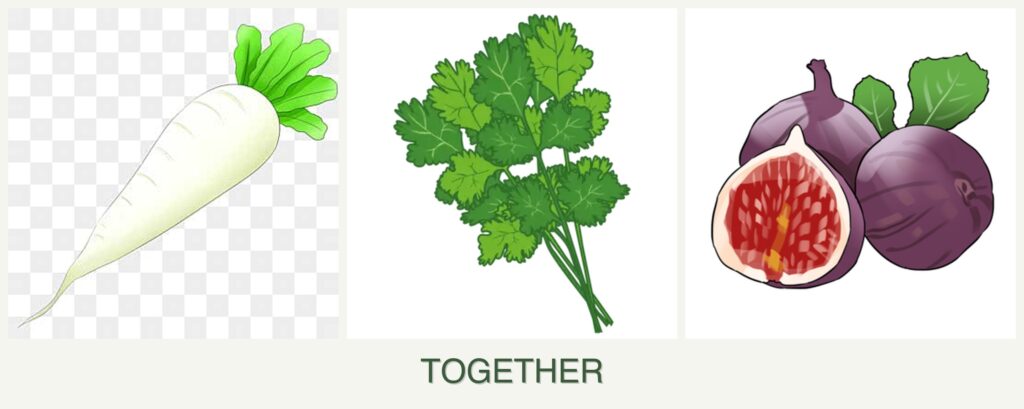 - Growth Requirements: Radishes and cilantro prefer cooler temperatures, whereas figs need warmth and full sun. Planting them in proximity requires careful planning to ensure each plant receives optimal conditions.