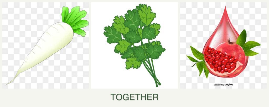 - Nutrient Needs: Radishes and cilantro can share nutrients effectively, while pomegranates need more substantial feeding.