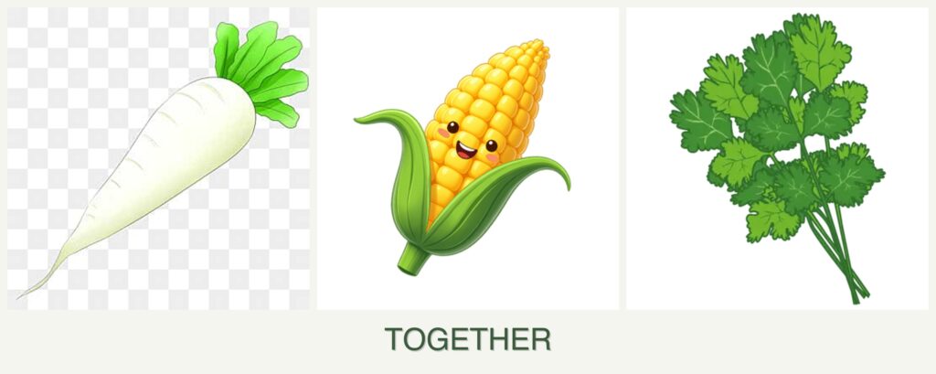 - Growth Requirements: Corn requires full sun and well-drained soil, while cilantro prefers cooler temperatures and partial shade, which corn can provide. Radishes thrive in similar conditions to cilantro.