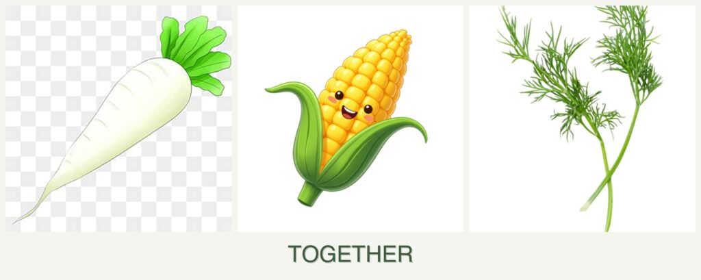 - Nutrient Needs: Radishes and dill have relatively low nutrient demands compared to corn, which is a heavy feeder.
