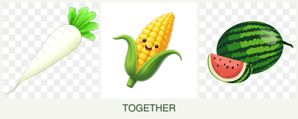 - Resource Competition: Corn’s high nutrient demand can outcompete radishes and melons if not managed with proper fertilization.