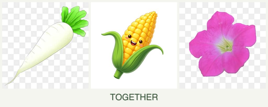 - Competition for Resources: Corn’s heavy nutrient demand can outcompete radishes and petunias if not managed properly.
