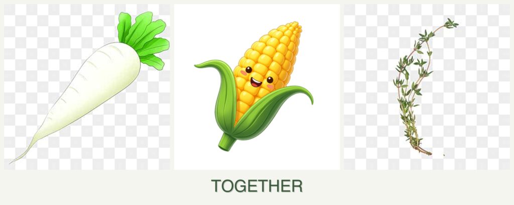 - Pest Repellent Properties: Thyme’s aromatic oils deter pests that might otherwise harm radishes and corn.