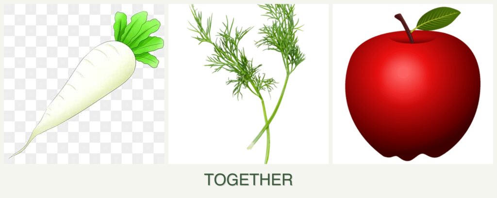 - Apples with Herbs and Vegetables: Apple trees can benefit from the pest-repelling properties of dill. However, the tree’s size and light requirements mean that radishes and dill should be planted at a distance that allows them to receive adequate sunlight.