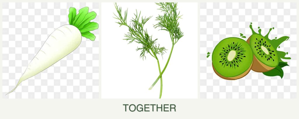 Radishes and dill are both cool-season plants that thrive in similar conditions, making them good companions. They can benefit from each other’s pest-repelling properties and complement each other in the garden. However, kiwi is a warm-season, perennial vine that requires a different climate and more space, making it incompatible with radishes and dill in the same planting area.