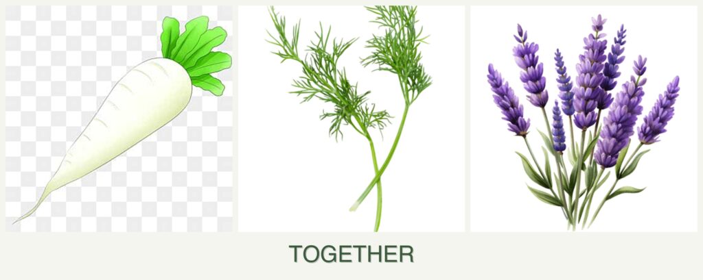 - Competition for Resources: Radishes, dill, and lavender have different water needs, which can lead to competition if not carefully managed.