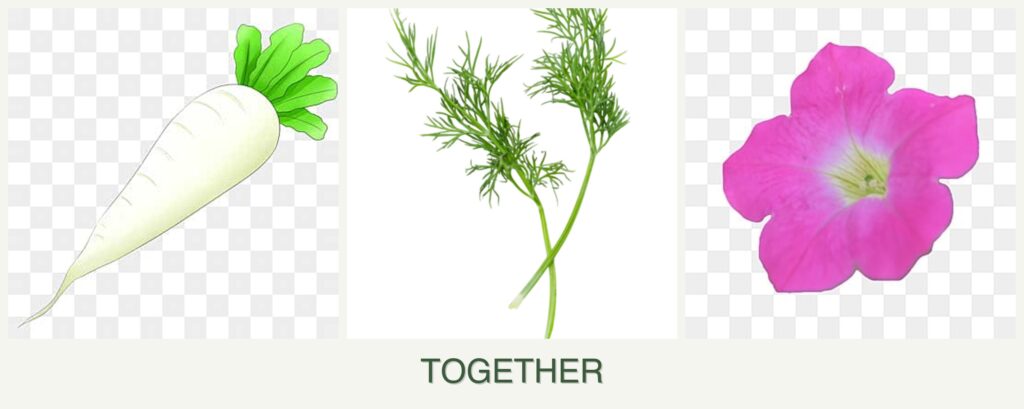 - Growth Requirements: Radishes and dill thrive in similar soil conditions and sunlight, while petunias can tolerate partial shade.