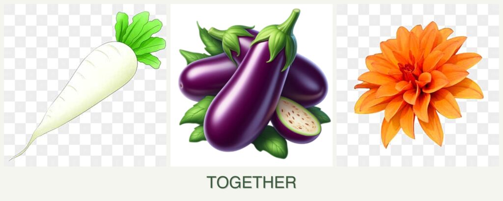 - Staggered Planting: Plant radishes first, then follow with eggplants and dahlias.