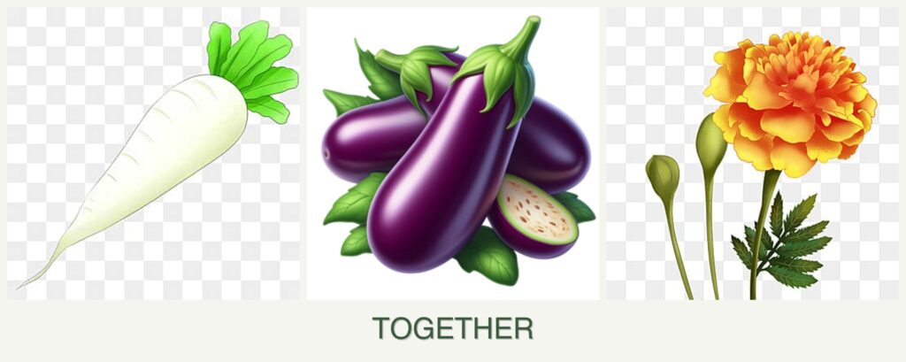 - Timing: Plant radishes in early spring or fall, while eggplants and marigolds prefer warmer conditions.