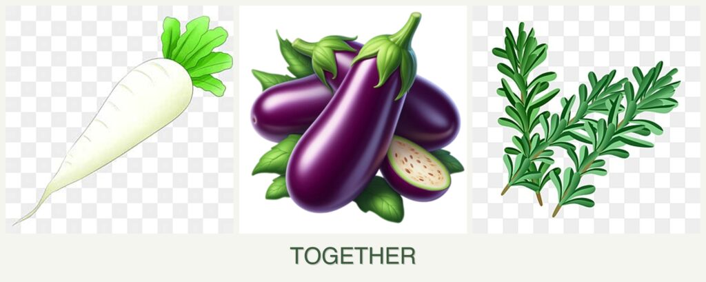 Nutrient Needs: Radishes are quick-growing root vegetables that do not require as much space or nutrients as the more demanding eggplants. Rosemary, being a woody herb, has different nutrient requirements and prefers well-drained soil, unlike the more moisture-loving radishes.