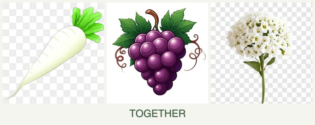 These plants work well together because they occupy different growth zones: radishes underground, grapes vertically, and alyssum as ground cover. Additionally, alyssum can attract pollinators and beneficial insects that help control pests in the garden.
