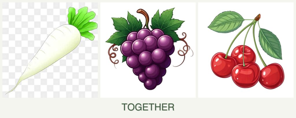 - Growth Requirements: Radishes prefer cooler weather, while grapes and cherries need warm conditions.