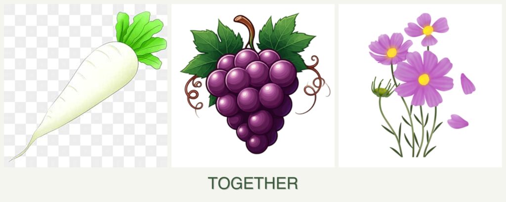 - Nutrient Needs: Radishes are light feeders, while grapes need a rich, well-drained soil. Cosmos are not nutrient-demanding, which makes them suitable companions.