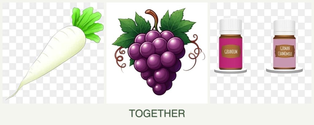 Resource Competition: Grapes require significant nutrients and space, which may overshadow radishes and geraniums if not managed properly.