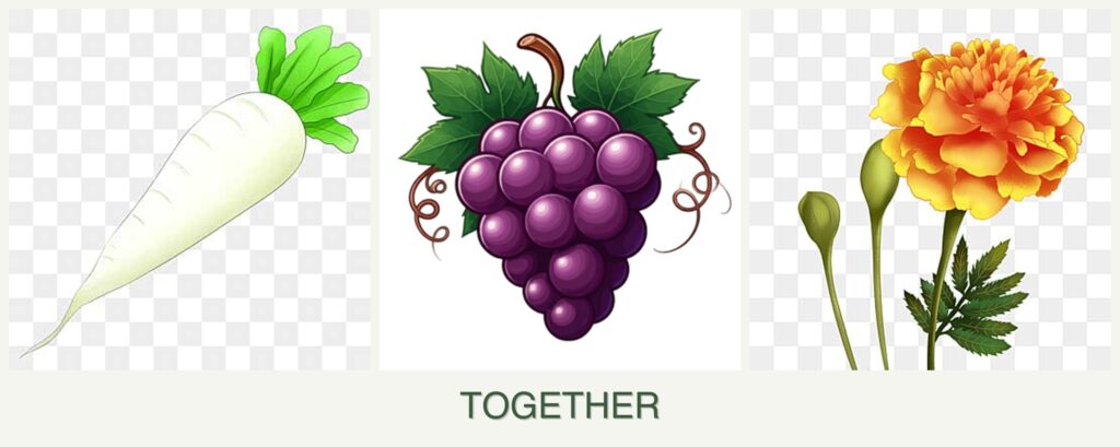 Growth Requirements: Radishes are quick-growing root vegetables that thrive in cooler temperatures, while grapes are perennial vines requiring warm, sunny conditions. Marigolds are hardy annuals that prefer full sun and can tolerate a range of temperatures. Their differing growth habits mean they won’t directly compete for space, allowing them to coexist peacefully.