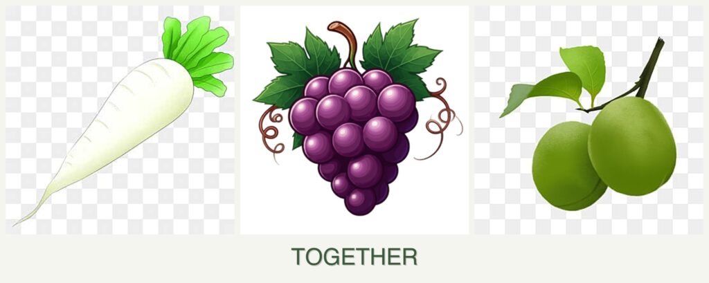 - Growth Requirements: Radishes thrive in cool weather, while grapes and plums need warmer conditions.