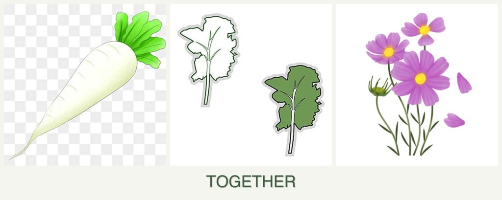- Growth Requirements: Radishes are fast-growing root vegetables, kale is a leafy green, and cosmos are flowering plants. Their differing growth habits mean they occupy different soil layers and light spaces.