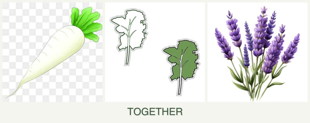 - Competition for Resources: Lavender’s preference for dry conditions can clash with the moisture needs of radishes and kale.