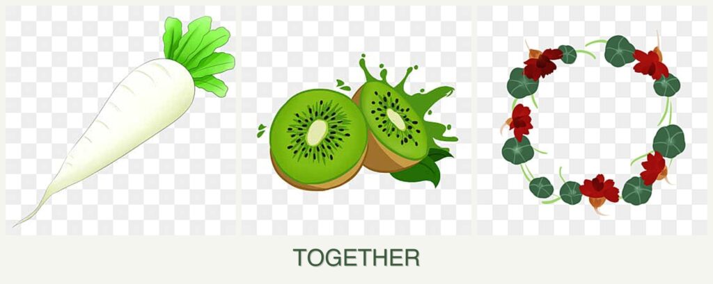 - Nutrient Needs and Spacing: Radishes are quick-growing and can be interplanted with nasturtiums, which spread low to the ground. Kiwis require more space and support structures.