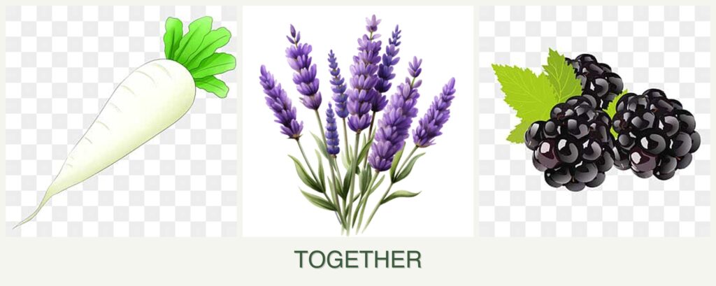 Improved Growth: The presence of lavender may enhance the flavor of radishes, while the quick growth of radishes can help suppress weeds around blackberries.