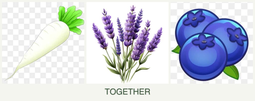 - Watering Needs: Lavender’s drought tolerance contrasts with the moisture needs of radishes and blueberries.