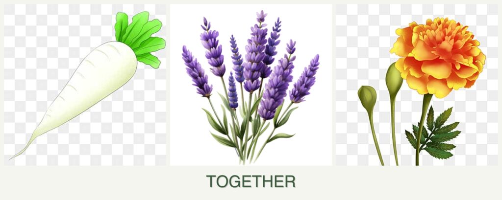 Planting radishes, lavender, and marigolds together offers numerous benefits:
