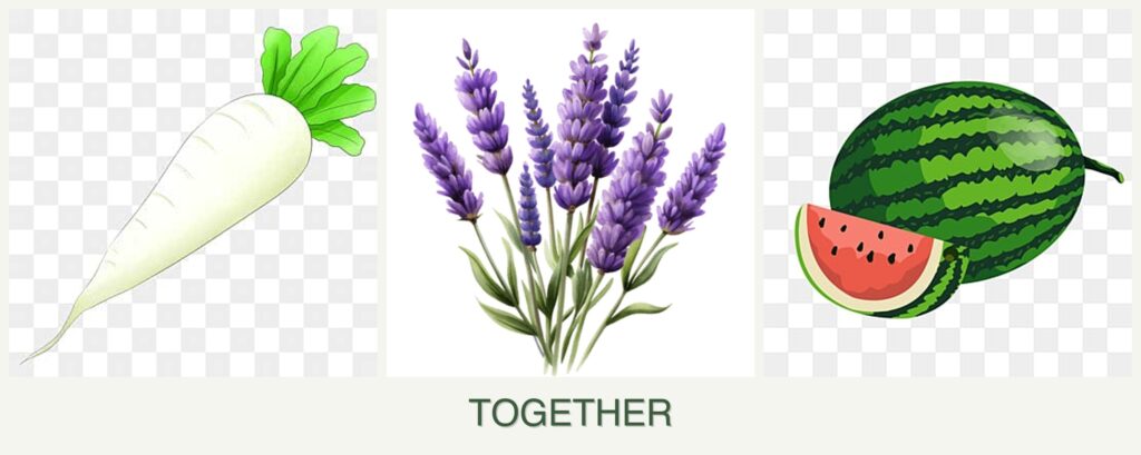 - Differing Water Needs: Lavender’s drought tolerance conflicts with the moisture needs of radishes and melons.