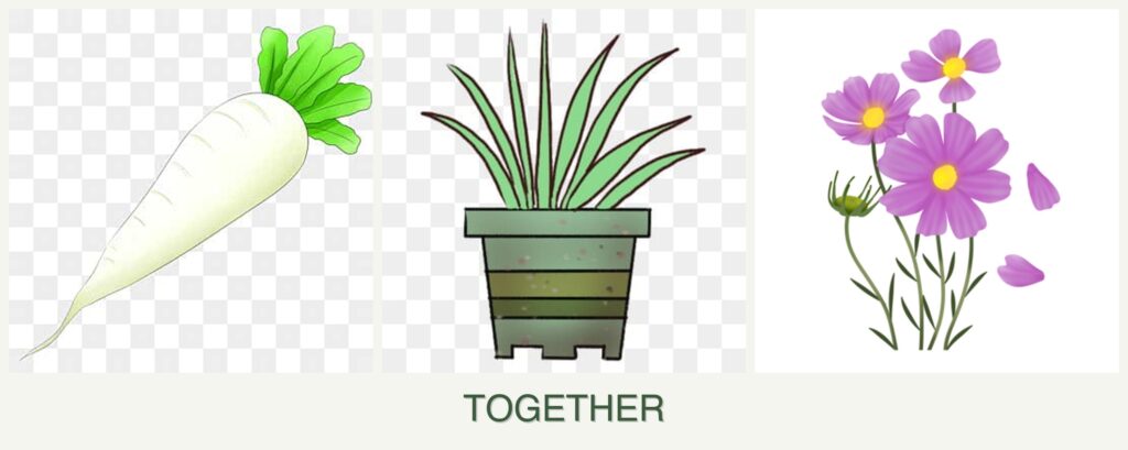 Pest Control: Radishes can deter certain pests that affect lemongrass and cosmos, such as aphids. Cosmos attracts beneficial insects like bees and butterflies, which can improve pollination and help control pests naturally.