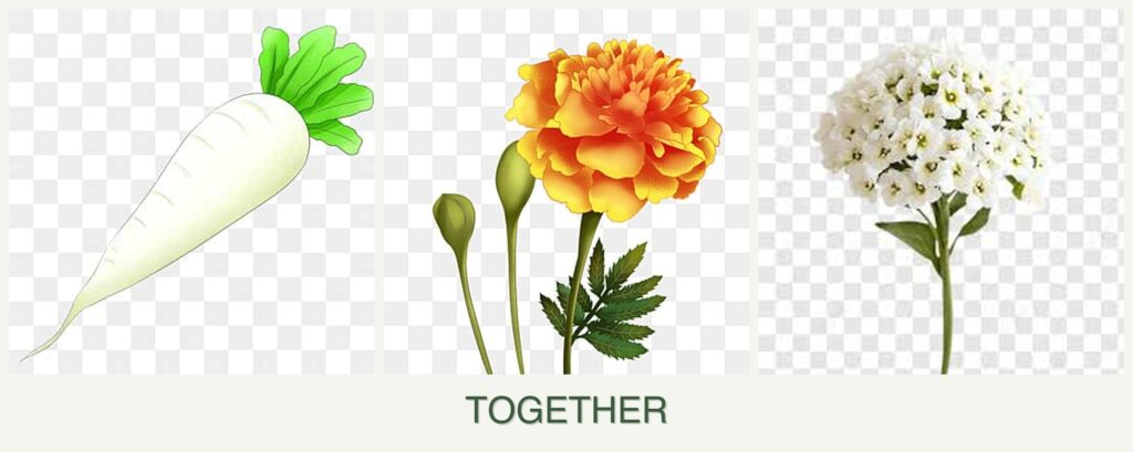 - Timing: Plant radishes early in the spring or fall, and marigolds and alyssum after the last frost.