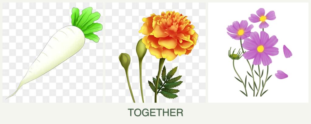 - Harvesting Considerations: Radishes mature quickly and should be harvested promptly to avoid disrupting marigolds and cosmos.
