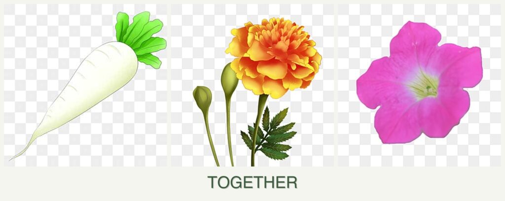 Planting radishes, marigolds, and petunias together offers several benefits: