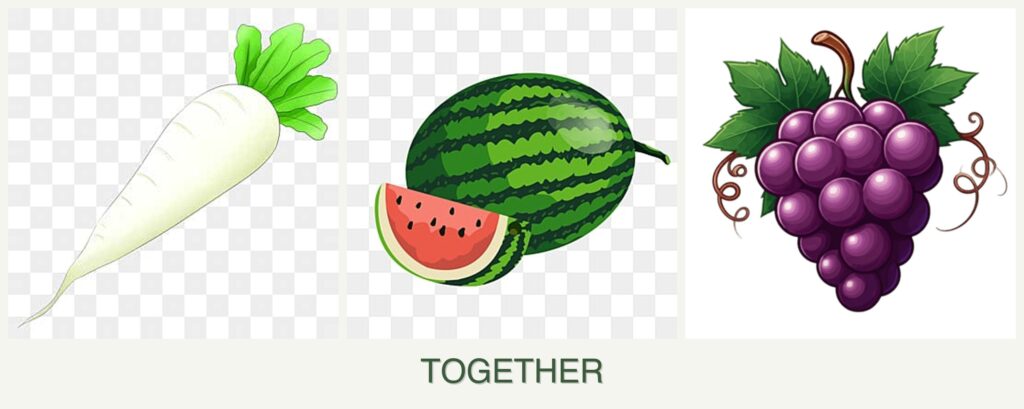 Spacing: Grapes and melons need significant space to spread, which conflicts with the compact, fast-maturing radishes.