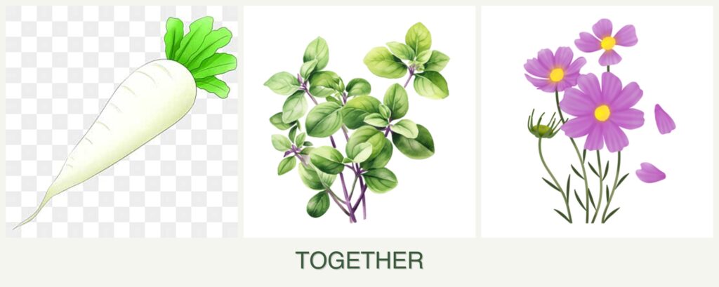 Planting radishes, oregano, and cosmos together offers several advantages: