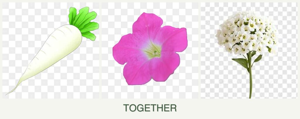 - Growth Requirements: Radishes grow quickly and mature before petunias and alyssum, minimizing competition for resources.