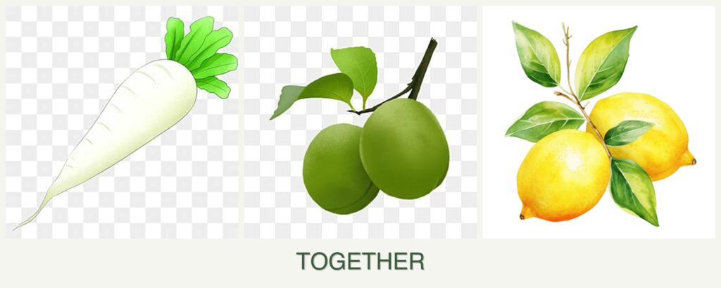 - Pest Control and Nutrient Needs: Radishes can deter pests like cucumber beetles, but they do not offer significant pest control benefits for fruit trees like plums and lemons. Additionally, the nutrient needs differ; radishes require less nutrient-rich soil compared to fruit trees.