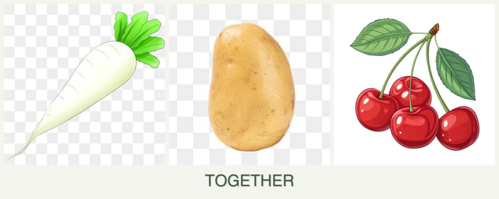 - Growth Requirements: Radishes and potatoes are root vegetables with similar space needs, but cherries are fruit trees requiring much larger areas and different soil conditions.