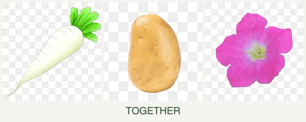 - Nutrient Needs: Radishes and potatoes both prefer nutrient-rich soil, while petunias are not as demanding. However, all three plants benefit from well-drained soil.