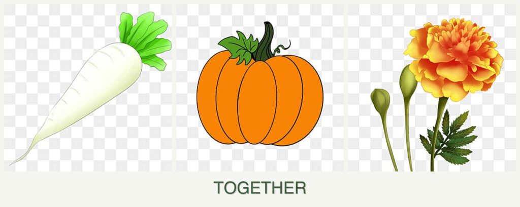 Planting radishes, pumpkins, and marigolds together offers several advantages: