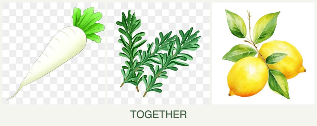 - Pest Control: Rosemary can repel certain pests, benefiting nearby plants, but radishes and lemons do not significantly aid each other in pest control.