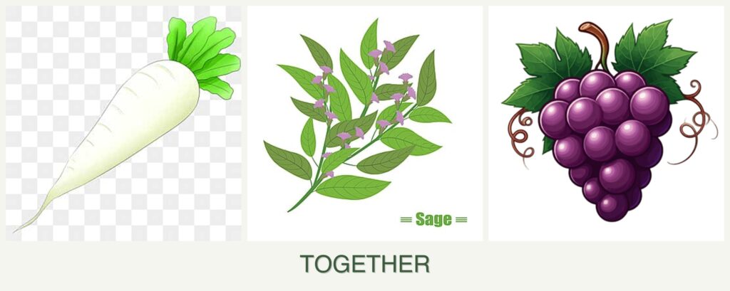 - Nutrient Needs: Radishes are light feeders, whereas grapes demand more nutrients, especially during fruiting. Sage, being a hardy herb, has moderate needs.