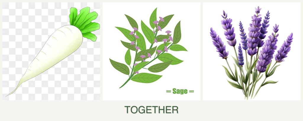 - Pest Repellent Properties: Sage and lavender can repel pests like aphids and beetles, which may otherwise harm radishes.