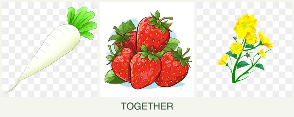 - Growth Requirements: All three plants thrive in full sun and require well-drained soil. Radishes mature quickly, allowing for staggered planting with strawberries.