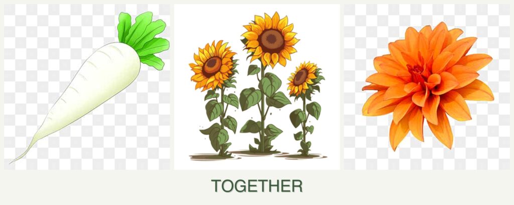 - Growth Requirements: Radishes grow quickly and can be harvested before sunflowers and dahlias reach maturity, minimizing competition.
