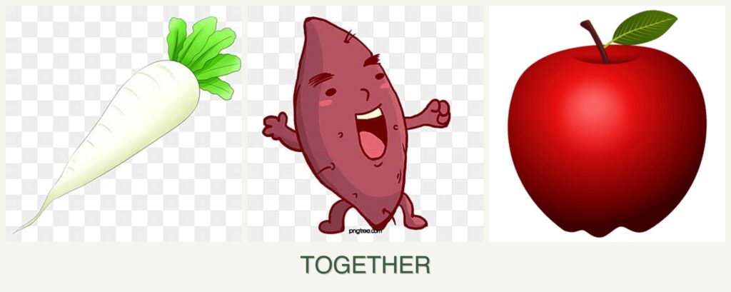 Radishes, sweet potatoes, and apples have different root structures and nutrient needs, leading to competition in shared soil.