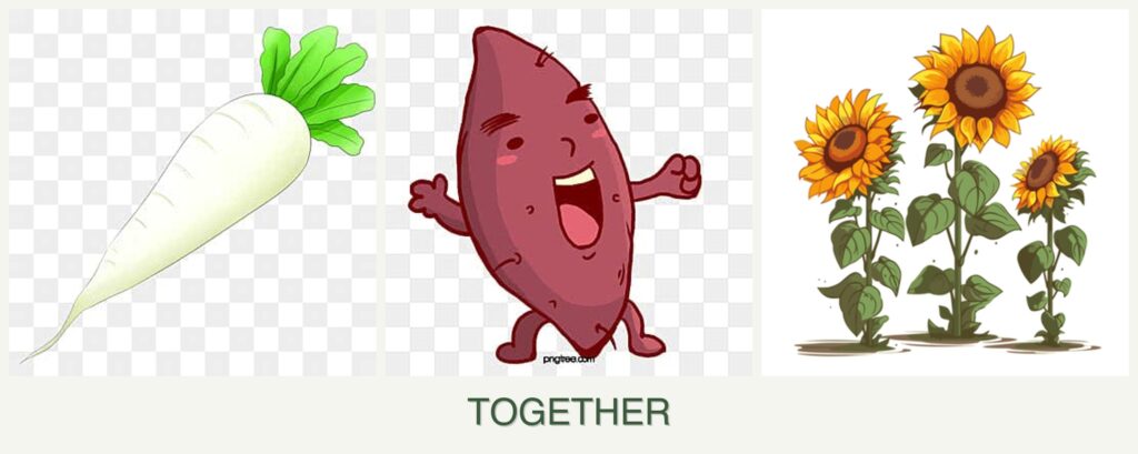 Growth Requirements: Radishes have a short growing season, while sweet potatoes and sunflowers take longer to mature. Their staggered growth can optimize space and resources.