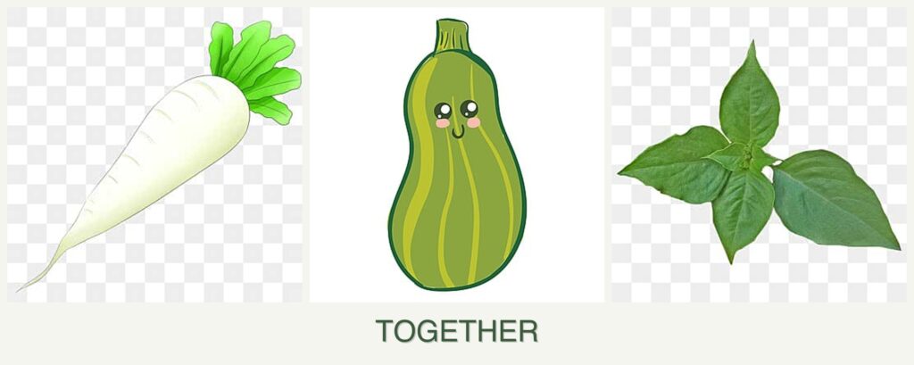 - Growth Requirements: Radishes and basil have shorter growing seasons than zucchini, allowing for staggered planting and harvesting.