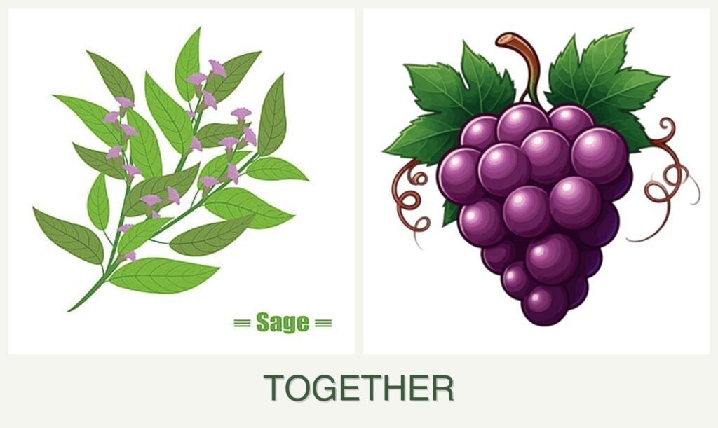 - Growth Requirements: Both sage and grapes prefer full sun and well-draining soil.