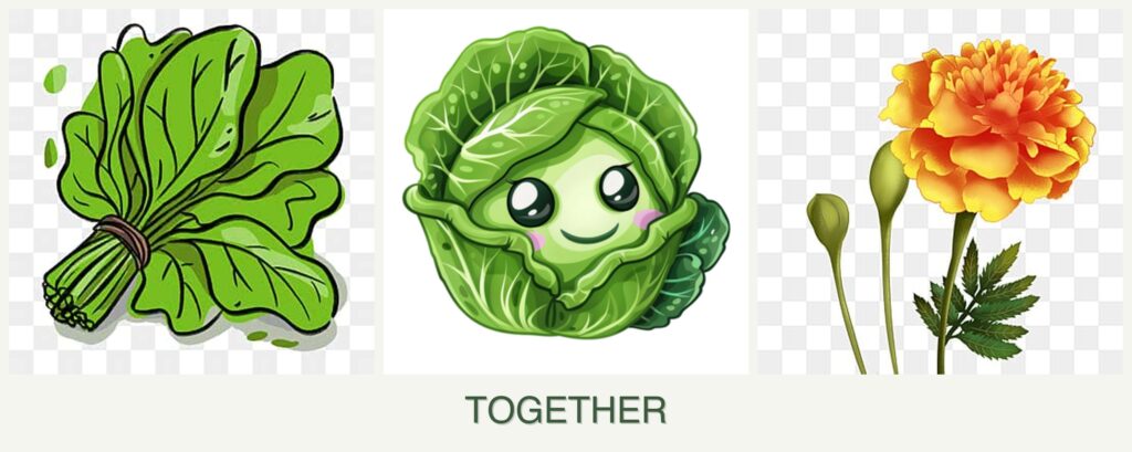 Planting spinach, cabbage, and marigolds together offers several advantages:
