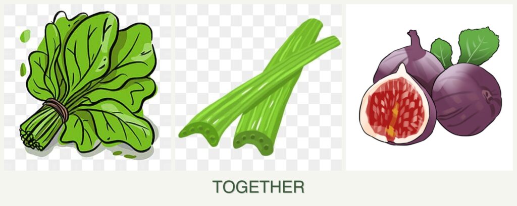 - Growth Requirements: Spinach and celery both prefer cool weather and can be planted in partial shade, which complements the needs of figs that require full sun but can provide some shade for the leafy greens.