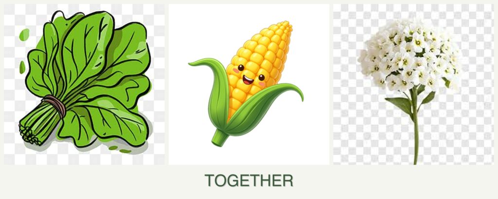 - Optimal Spacing: Maintain appropriate distances—corn at least 12-18 inches apart, spinach 6 inches, and alyssum 6-12 inches.